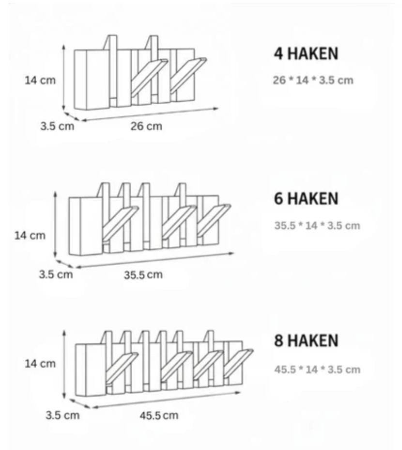 4, 6 oder 8 Haken in drei Größen — passend für jeden Flur und jede Haushaltsgröße.